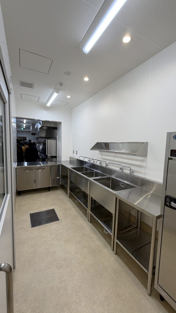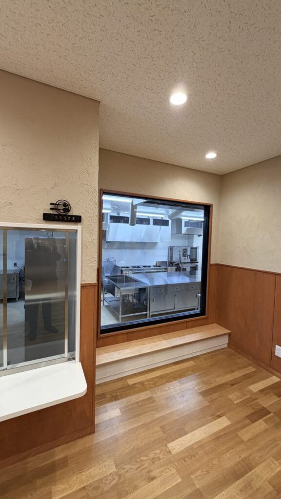 給食の調理室。子どもたちが中の様子を見れるように、ガラス張りになっています。