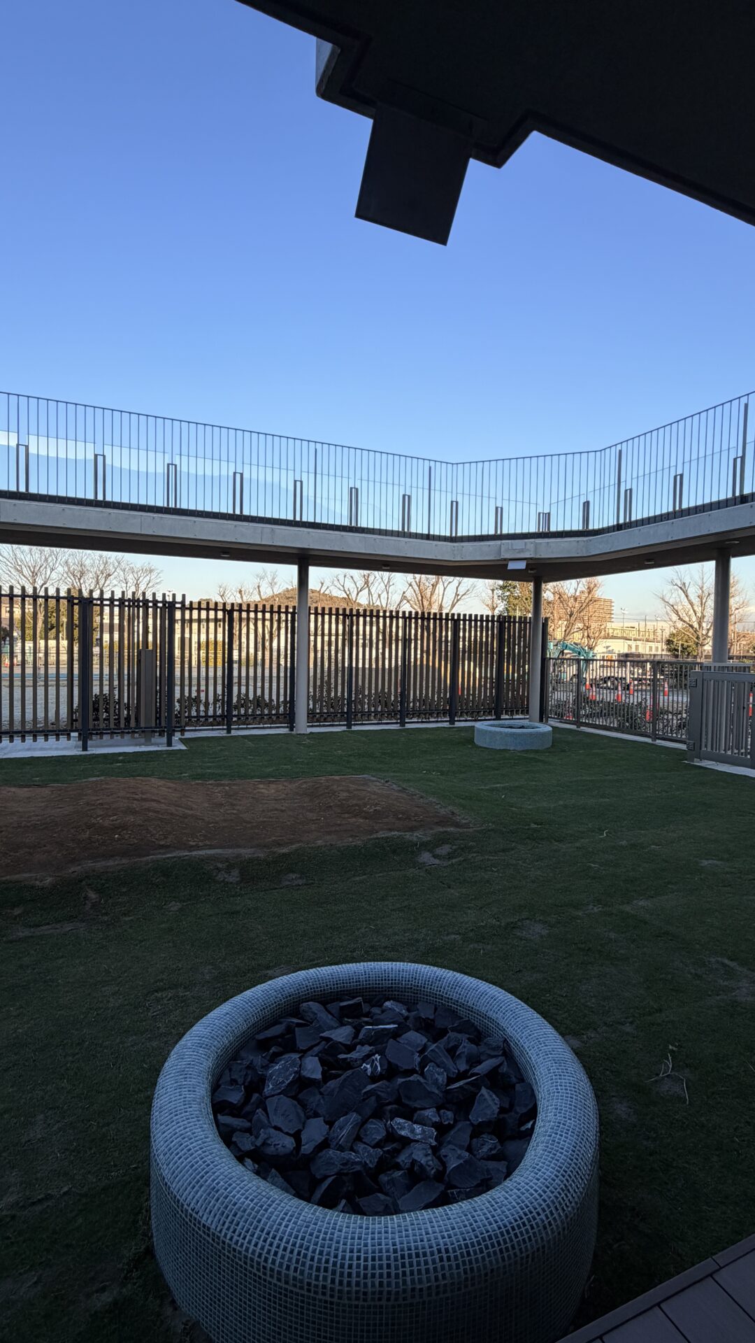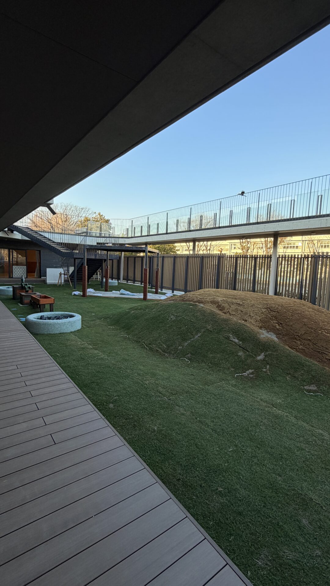 2Fからは園庭をぐるっと囲むようにウッドデッキが続きます。