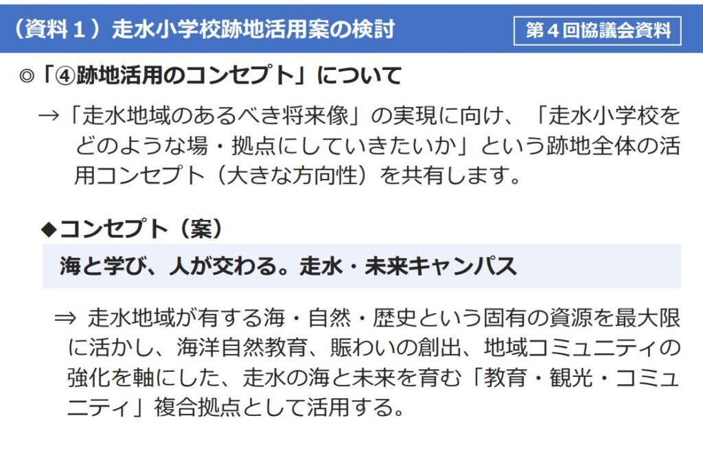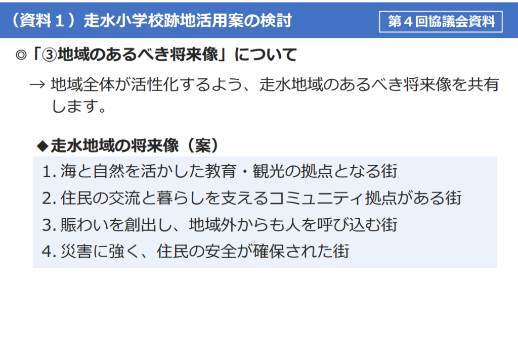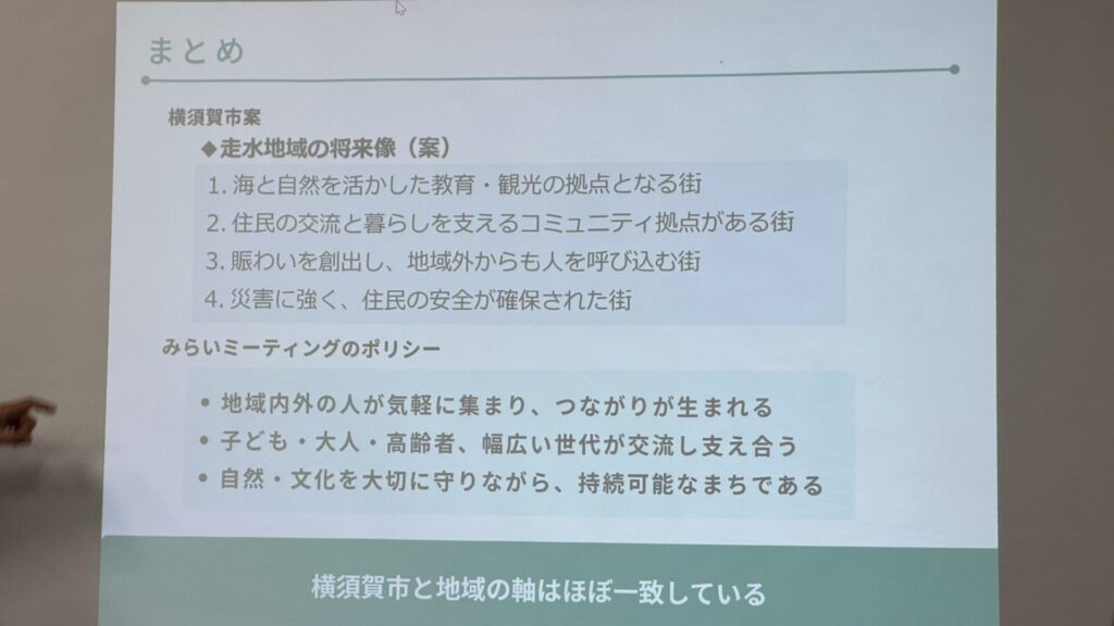 この方向性について、「走水みらいミーティング」としては概ね自分たちのポリシーと重なるところであるようです。