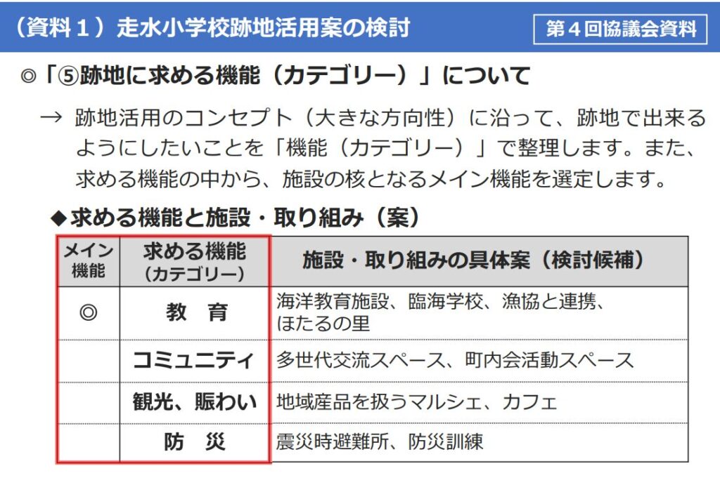 今後はこの「教育×コミュニティ×観光×防災」という機能性を持たせるとして、具体的にどのような施設を作っていくのかが議題となります。