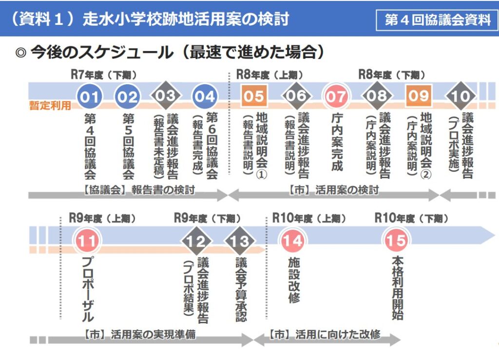 下記のスケジュール表のように、今年度で一旦地域の方が参加する協議会が終了となり、R8年度からは市が検討するフェーズに入る予定です。